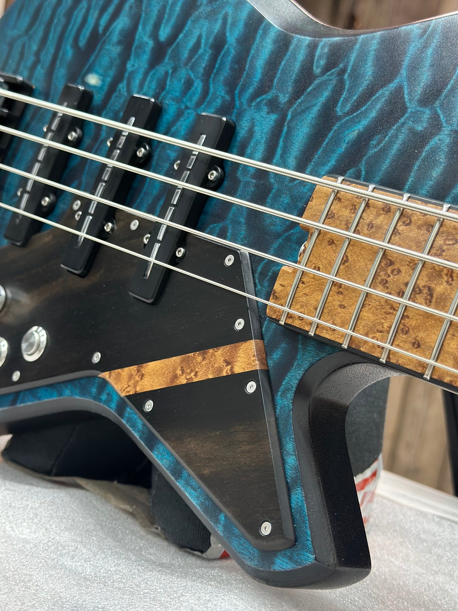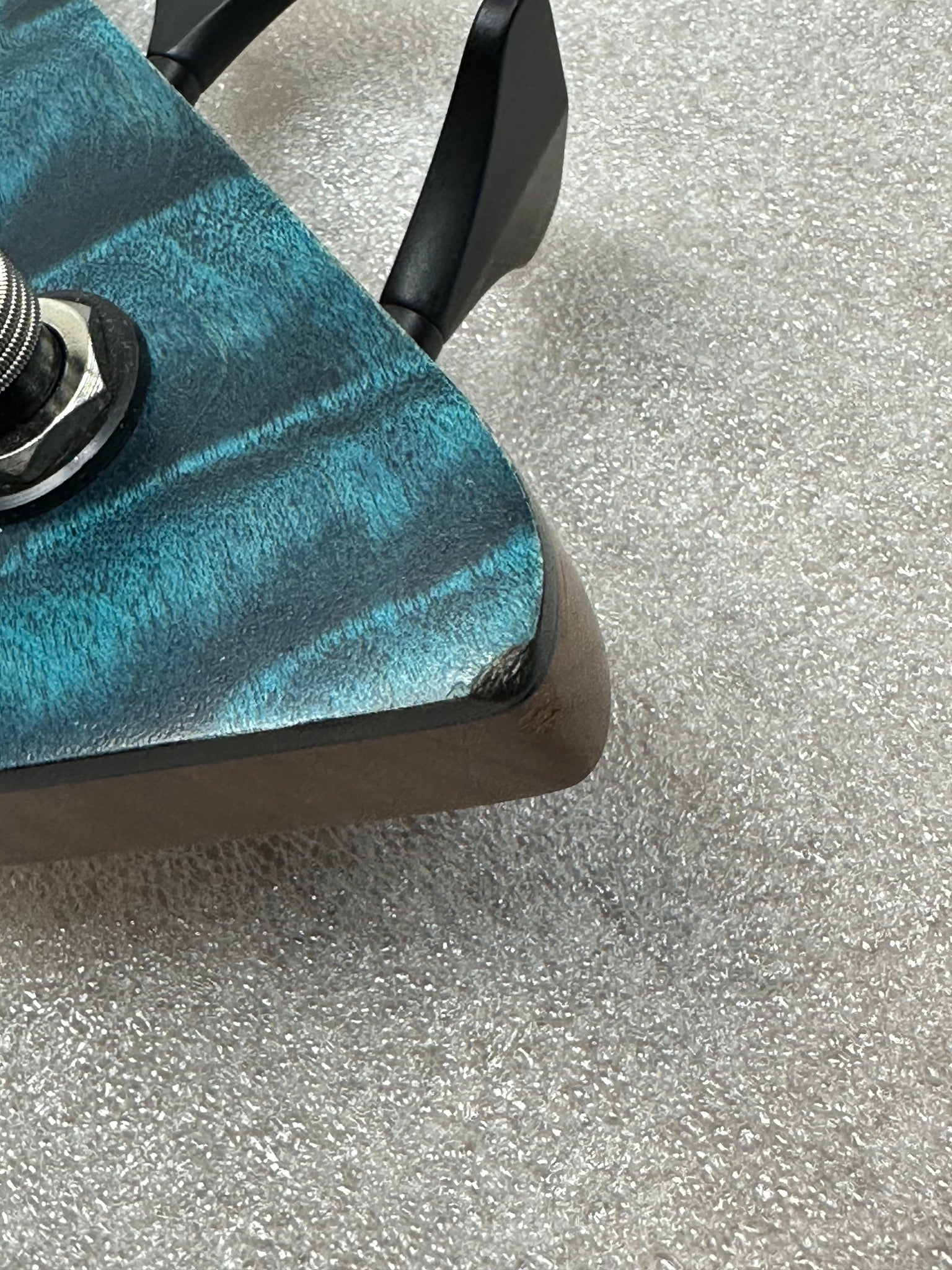- Ebony pickguard with roasted birdseye maple accent